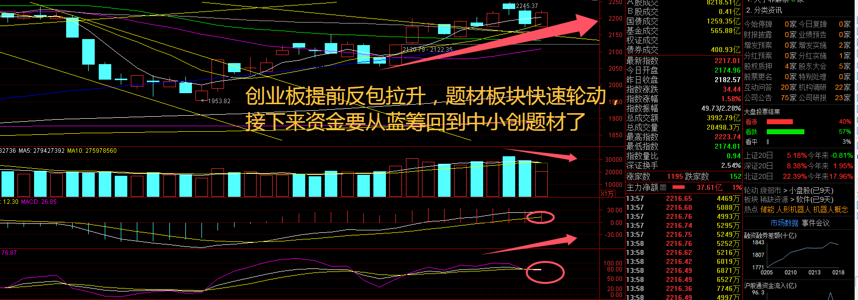 创业板指数周三出现强势反弹,重新回到5日线和10日线之上,2200点一线有明显的护盘迹象,这个位置已经横盘2周时间,近期要做出新趋势方向选择了,60日线是大资金的最后支撑线。两市震荡调整,但是成交依然维持高位,指数走势依然较为健康。横纵向对比来看,A股TMT板块交易拥挤度偏高,一旦指数出现调整,可耐心等待调整结束,追涨需谨慎。接下来注意创业板指数能否在2220点之上稳住。