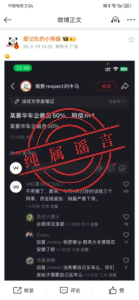 蔚来官方辟谣“裁员50%”:离谱到家 法务部已报警