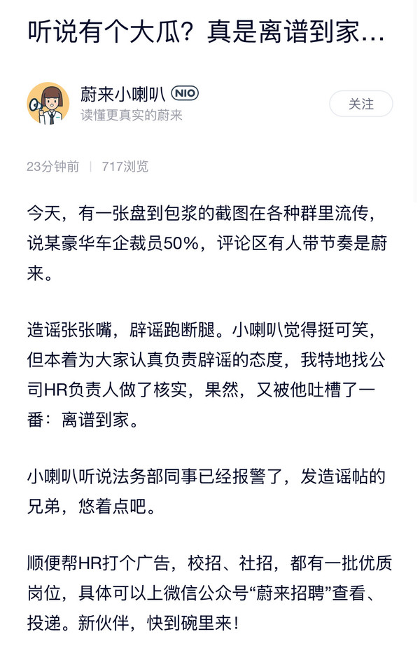 “蔚来小喇叭”还透露,蔚来法务部已经报警了。顺便帮HR打了个招聘广告,进一步暗示“蔚来裁员50%”是谣言。
