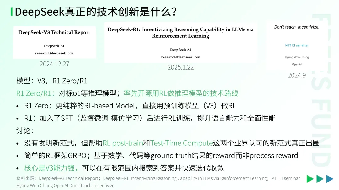 因此,DeepSeek核心的贡献是帮助强化学习、Test-Time Comput这两个范式快速出圈。相比其他模型厂商,它手比较快,而且直接把工作开源了。