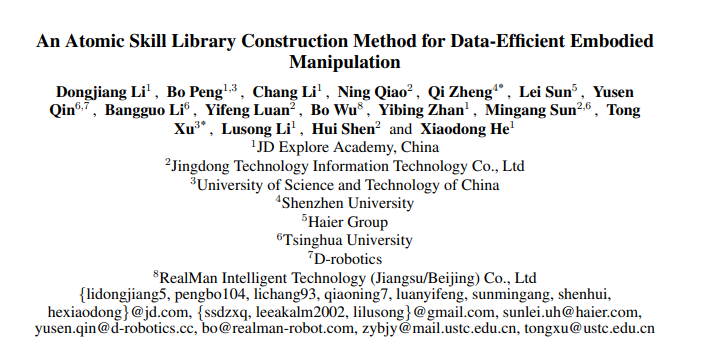 为此,京东探索研究院李律松、李东江博士团队发起了该项目,联合地瓜机器人秦玉森团队、中科大徐童团队、深圳大学郑琪团队、松灵机器人及睿尔曼智能吴波团队共同推进,得到了清华 RDT 团队在 baseline 方法上的技术支持。我们提出首个基于三轮数据驱动的原子技能库构建框架,突破传统端到端具身操作的数据瓶颈。该方法可动态自定义和更新原子技能,并结合数据收集与 VLA 少样本学习构建高效技能库。