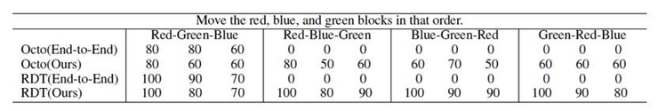 前三个任务用于验证所提方法在数据效率和操作性能上的表现,第四个任务则评估其新任务适应能力。为确保公平性,每种实验设置均在 Octo 和 RDT-1B 上进行 10 次测试,对比端到端方法与所提方法(“Ours” 和 “Ours-plus”)。如表1所示,“End-To-End”:原始端到端 VLA 方法; “Ours”:保持数据分布一致,但数据量更小; “Ours-plus”:保持数据量一致,但采集更多点位;“ID”:任务点位在训练数据分布内;“OOD”:任务点位超出训练数据分布。在第四个任务中,设定红-绿-蓝顺序抓取积木为已知任务,并采集数据训练模型。针对其他颜色顺序的未知任务,直接调用已训练的技能进行测试,以评估方法的泛化能力(见表 2)。结果分析如下:
