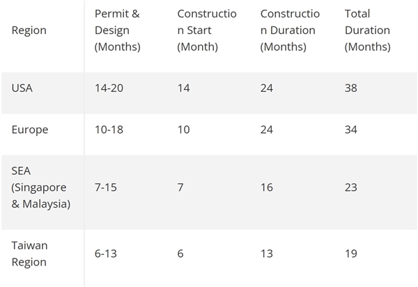 Exyte指出,在中国台湾建设一座晶圆厂大约需要19个月,而在美国,同样的项目却需要长达38个月,新加坡和马来西亚等需要23个月,欧洲则需要34个月