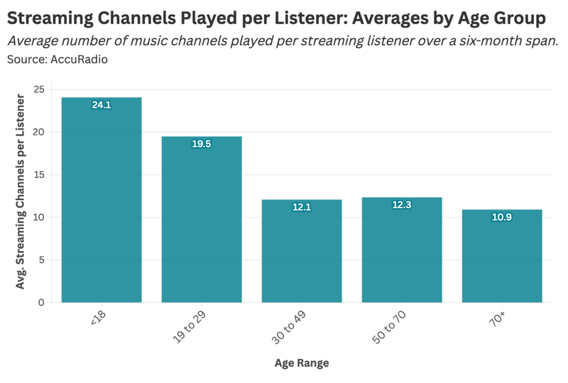 最近,Stat Significant平台对互联网广播电台AccuRadio用户的研究,揭示了不同年龄段人群收听习惯的代沟。00后用户平均每10首就要切歌一次,践行着"音乐海王"的生存法则;而走过磁带与唱片岁月的70、80世代,对于单曲循环1000次早已习以为常,宛若数字时代的禅修仪式。