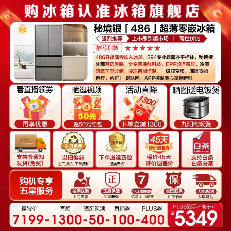 海尔486L法式多门冰箱干湿分储一级保鲜仅4319元