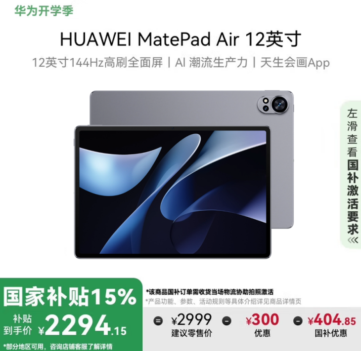 开学享国补,来点新装备。2月12日-3月16日,华为开学焕新季,多重优惠来袭,国家补贴至高20%,限时优惠叠加国家补贴至高优惠3049元,平板键盘、手写笔8折,购买搭载酷睿™ Ultra处理器的华为笔记本赠送鼠标,更有学生、教师专属教育认证更优惠。