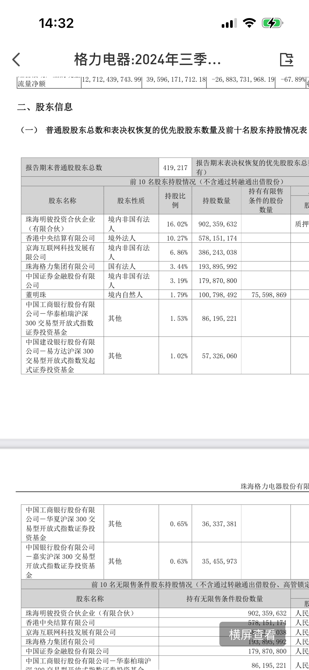 目前,格力电器是无实际控制人的企业,珠海明骏投资合伙企业(有限合伙)在格力电器中持股16.27%,为第一大股东;格力核心经销商的合资公司京海互联,在格力电器中持股6.97%,为第三大股东。格力电器2024年三季报显示,董明珠持有格力电器100798492(约1亿)股股票,在格力电器的持股比例为1.79%,是格力电器第六大股东。此外,格力电器曾公告透露,董明珠与珠海明骏是一致行动人士。