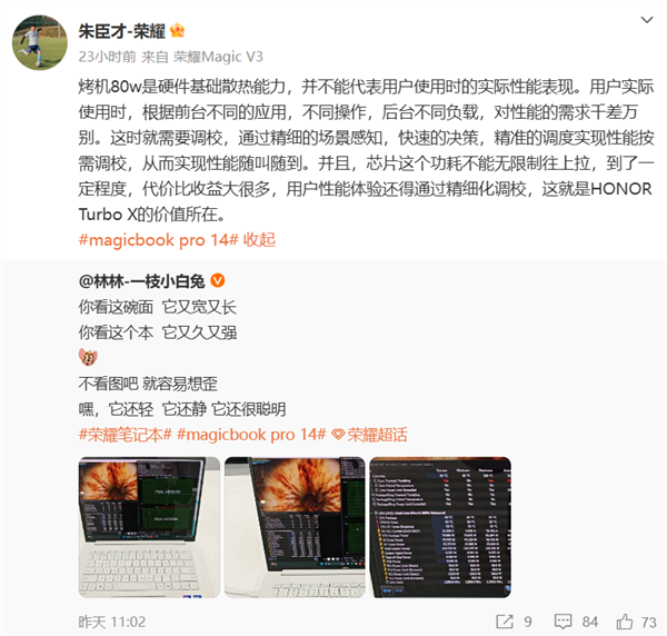 不过硬件的强大只是基础,荣耀深知真正的用户体验提升还需要精细的调校,正如荣耀PC 产品线总经理朱臣才所言:“烤机80W是硬件基础散热能力,并不能代表用户使用时的实际性能表现。”
