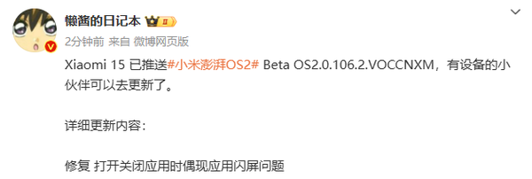 小米15正式推送澎湃OS 2测试版 修复应用闪屏问题
