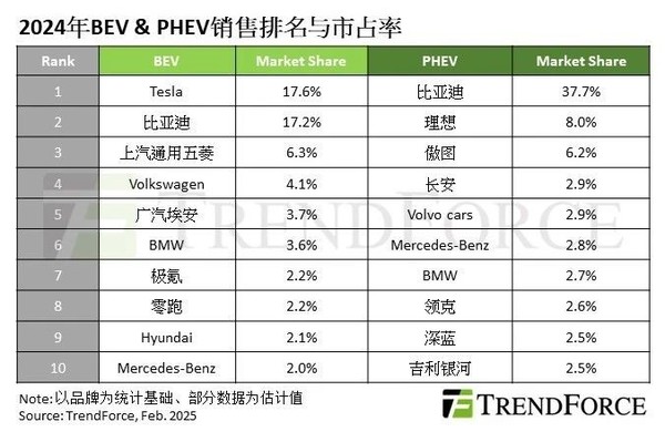 2024年全球纯电市场车企市占率排行 特斯拉比亚迪前二