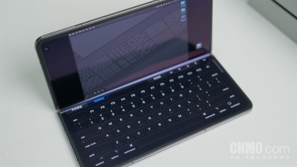 得益于OPPO Find N5内部一块8.12英寸屏幕,以及9.9:9的屏幕比例,Mac上的内容能够很好地显示在手机上,而且O+互联还提供了手机与电脑两套键盘,其中开启“电脑键盘”后再将手机折叠起来,OPPO Find N5还有一种“迷你版MacBook”的观感,它的日常使用体验,也与Mac无异。