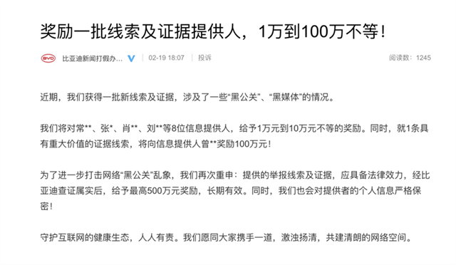 2月19日,比亚迪新闻打假办宣布,对8位“黑公关”相关信息提供人给予1-10万元不等的奖励,同时,对1位具有重大价值的证据提供人奖励100万元!针对“黑公关”,比亚迪始终保持零容忍,将一追到底。