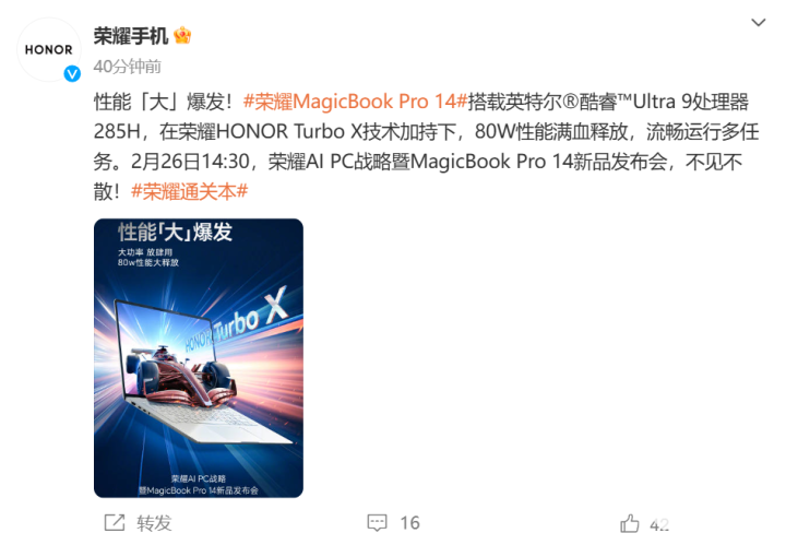 此前,荣耀已经官宣其荣耀MagicBook Pro 14笔记本新品发布会定档2月26日,将首发搭载新一代底层调校技术 HONOR Turbo X,官方称其为“性能风暴、续航狂飙”。相信不少用户都对这款产品充满期待。今天荣耀官方表示,全新的荣耀MagicBook Pro 14将搭载英特尔酷睿Ultra 9 285H处理器,并且带来强悍的性能释放。