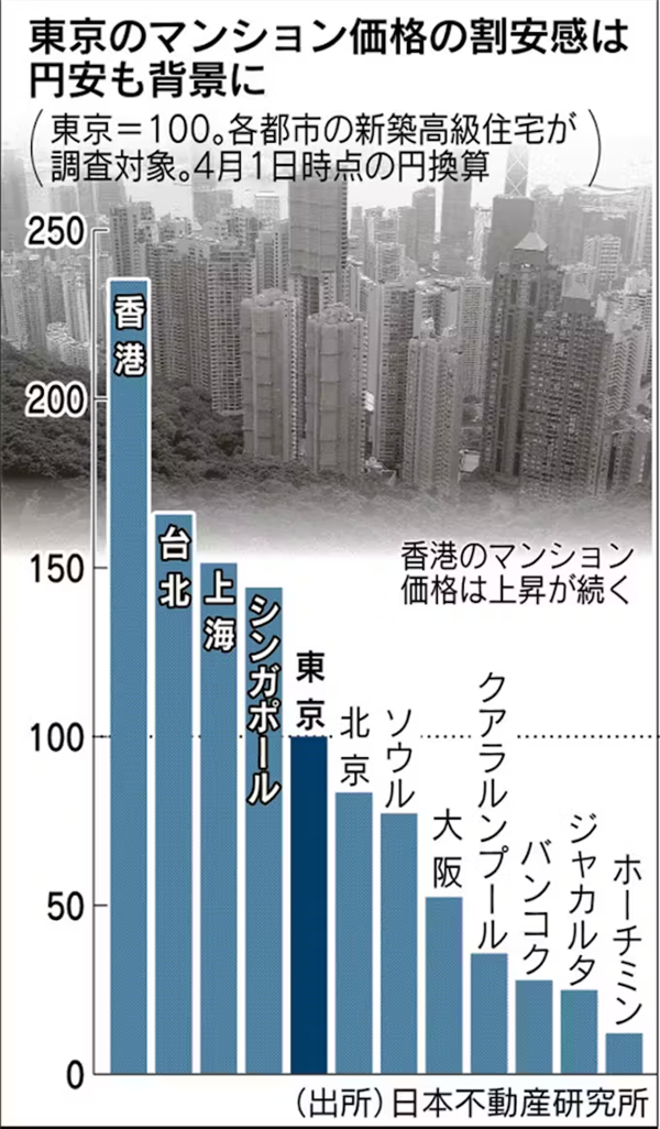 如果将东京港区元麻布的分户出售住宅的每坪(3.3平方米)单价定为100,那么大阪为68.2,上海为165.6,纽约为144.6,伦敦为207.5,最贵的香港是268.2,比东京高出一点五倍还多。