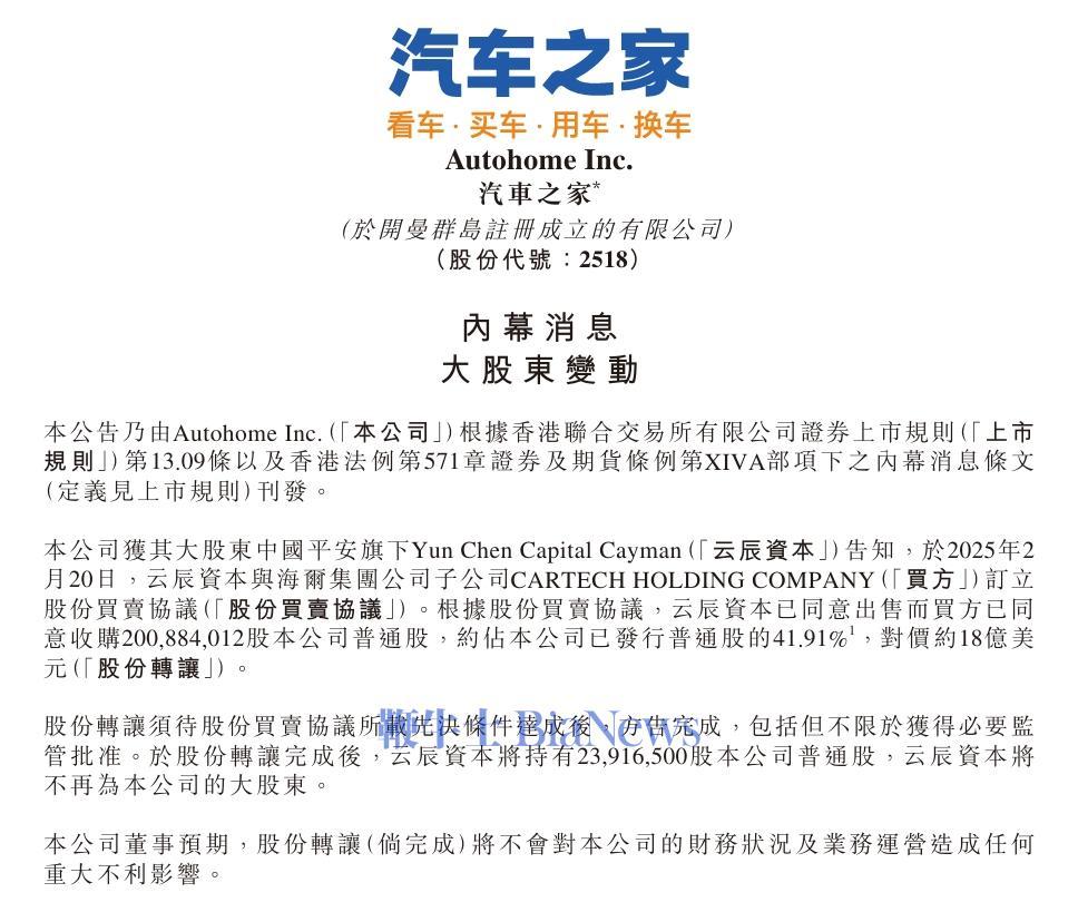 鞭牛士 2月20日消息,汽车之家公告,公司获其大股东中国平安旗下Yun Chen Capital Cayman(“云辰资本”)告知 ,于2025年2月20日,云辰资本与海尔集团公司子公司CARTECH HOLDING COMPANY(“买方”)订立股份买卖协议。根据股份买卖协议,云辰资本已同意出售而买方已同意收购200,884,012股本公司普通股,约占公司已发行普通股的41.91%,对价约18亿美元。