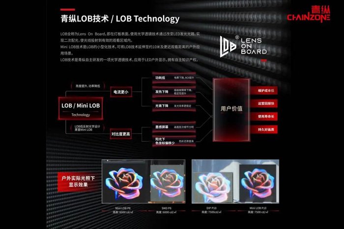 Mini LOB户外显示技术是青纵在LED户外显示领域的又一重大突破,这一技术可将青纵的LOB透镜技术拓展至户外近景场景,在提升LED户外显示屏的屏体亮度、降低屏体功耗的同时,通过低反射光学设计提升了屏体的对比度,具备运营回报快、维护成本低、使用寿命长、持久好画质的综合优势。