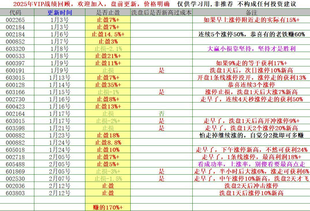 恭喜今天的目标关注后涨停12.7%,看上面表格看1月至今战绩,欢迎加入我的短线战队VIP