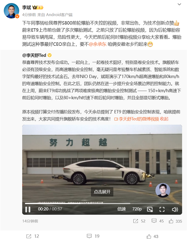 同时,李斌还表示,爆胎测试这种事最好CEO亲自上,要不余总咱俩安徽老乡约起来?