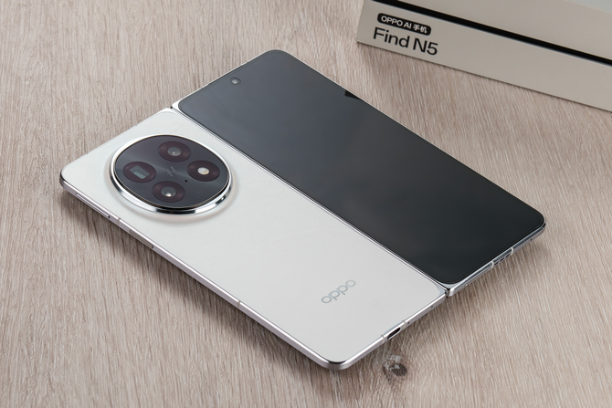 设计方面,Find N5带来了独特的「流光云环」设计,以方与圆的线条交织,将摄影模组与手机后盖自然融合,勾勒出一体化的设计美感。模组周围一圈超低台阶的设计,打破了传统纯圆形模组的呆板,通过光线的流动展现出灵动之美,既保留了轻薄的视觉观感,又让「方圆有度」的哲学在细节中得以彰显,完 美平衡了形式与功能的关系。