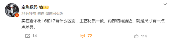 博主称iPhone 17和16几乎没有区别 唯一差别是尺寸
