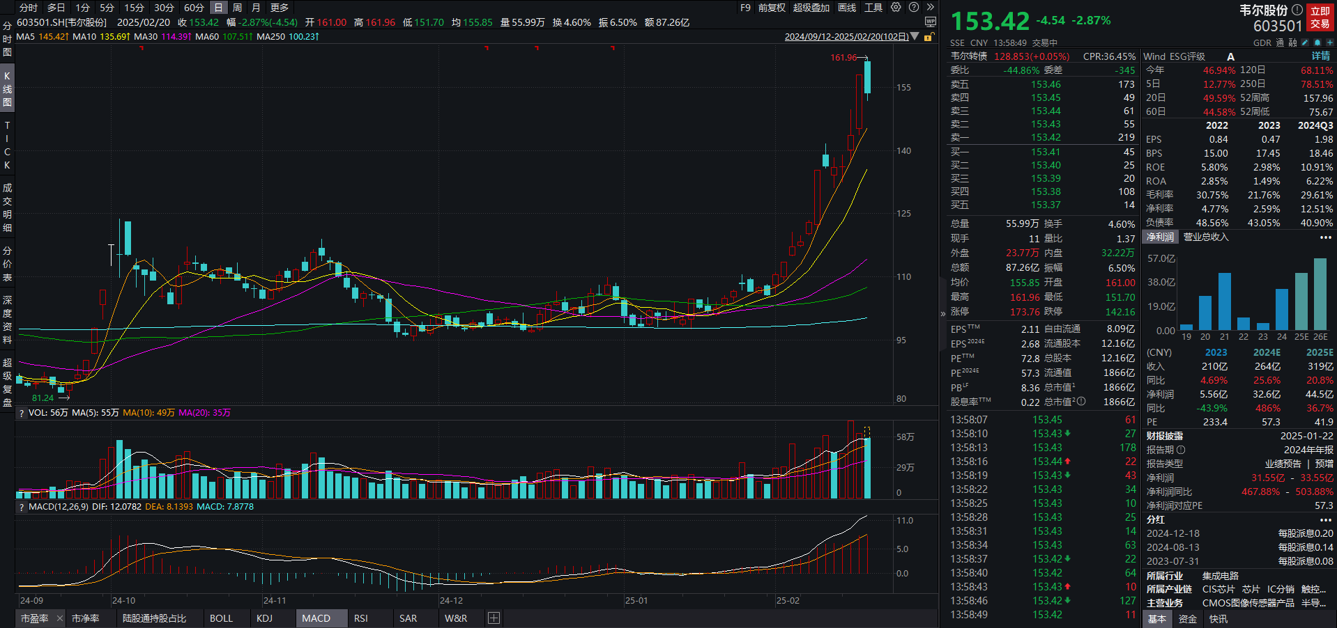 据2024年度业绩预增公告,韦尔股份 2024 年预计实现营业收入 254.08 亿 - 258.08 亿元,同比增 20.87% - 22.78%;归母净利润 31.55 亿 - 33.55 亿元,同比增467.88%-503.88%。