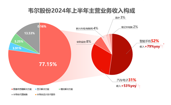 在韦尔股份2024年上半年来自图像传感器解决方案的收入中,智能手机、汽车电子行业分别占比52%、31%,同比增速分别达到79%、53%。