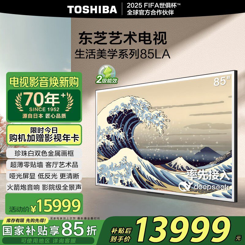 2024新品:东芝85LA艺术电视,超薄4K画框,97%色域,无缝家居体验与沉浸式音效
