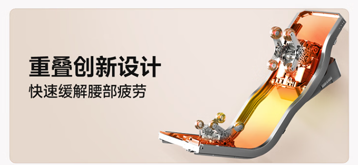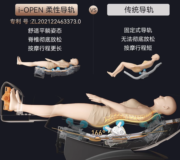 专利柔性导轨技术:可实现166°大角度开合平躺,贴合脊柱自然曲线,脊椎彻底放松,按摩形成更长,按摩范围延长25%,尤其适合腰椎不适人群。
