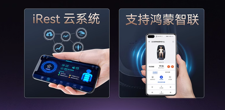 智能互联:支持手机iRest云app或鸿蒙智联操控,自定义按摩方式OTA在线升级程序,常用常新。