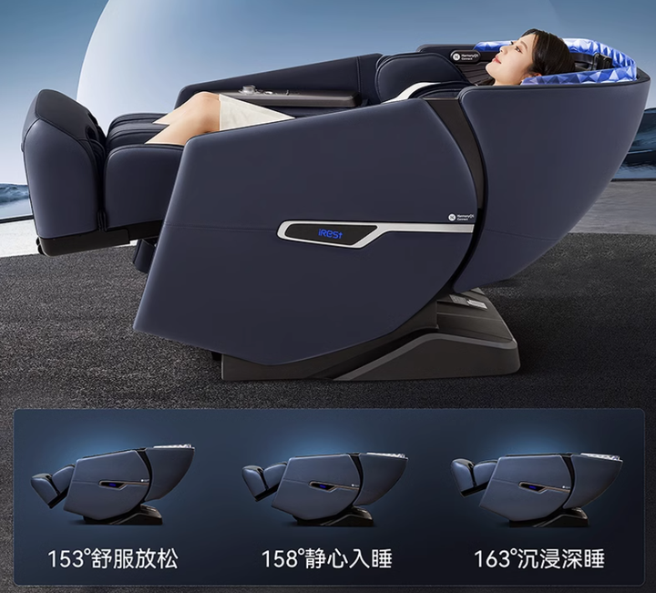 零重力太空舱:三档零重力模式(153°-163°零重力大仰角),3档可调,模拟宇航员失重状态,分散脊柱压力,搭配光谱助眠灯与香薰系统,沉浸式放松体验。