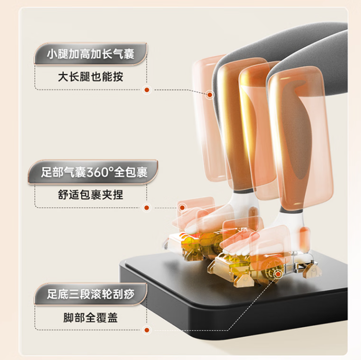 柔和与力度兼得:4D气囊缓冲技术,力度柔中有力,不耐受强力度的人群(如老年人)也能舒适使用。