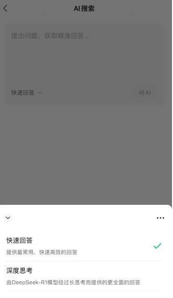 此外,除了元宝,腾讯旗下的微信也于近期正式灰度测试接入DeepSeek模型。顶部进入搜索栏后,页面出现“AI搜索”入口,点击后出现输入框,并有“快速问答”、“深度思考”两个选项可选。