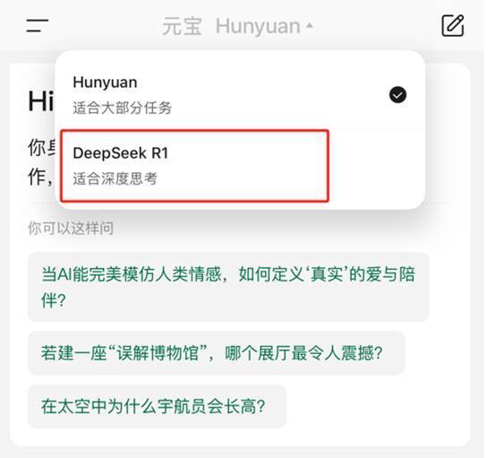 近期,腾讯旗下混元App正式接入DeepSeek-R1模型,目前混元App同时支持混元模型和DeepSeek两大模型。