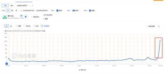 伴随着元宝接入DeepSeek,元宝在市场上的影响力及下载量激增。