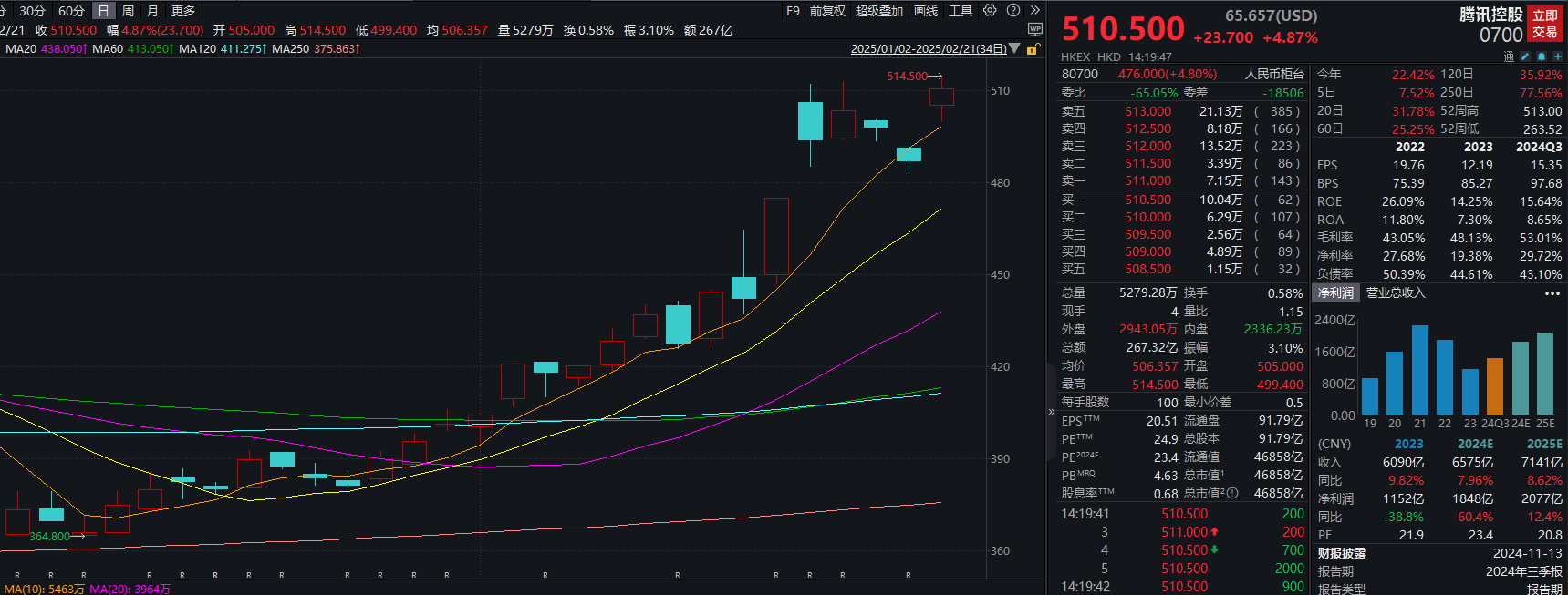 腾讯控股作为重要的软件入口,受到投资者追捧。截至2月21日下午2点,腾讯控股年内股价上涨超过20%,股价突破500港元/股。
