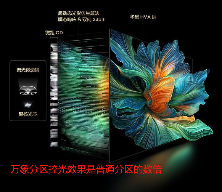 电视刚到家,我就迫不及待地打开体验,瞬间被它的画质深深俘获。这背后就不得不夸夸TCLC11K搭载的万象分区技术堪称一绝,它并非简单地在背光分区数量上做文章,而是从背光到成像显示,构建了一整套完整的、全链路的系统性光学方案。通过全面升级的聚核光芯、超聚光微透镜、微距OD、瞬态响应、双向23bit、超动态光影仿生算法,以及采用了自研的高端华星HVA屏等核心技术,使得万象分区的控光效果相较于普通分区有了质的飞跃,是普通分区的数倍。“一区顶多区”绝非浪得虚名,就拿我家这台85吋的C11K来说,虽说看着只有1568个万象分区,然而实际观影体验却是轻松超越那些号称3000级普通分区的电视,有效消除了光晕问题,画面层次感分明,亮暗过渡自然细腻,以前老电视上常见的模糊、没层次问题彻底消失不见。