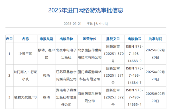 快科技2月21日消息,今日,国家新闻出版署发布2025年2月份游戏审批信息,其中有110款国产游戏、3款进口游戏获批。