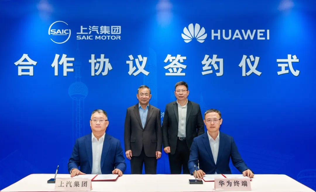 上汽集团董事长王晓秋,华为常务董事、终端BG董事长、智能汽车解决方案BU董事长余承东见证签约。上汽集团总裁贾健旭、华为终端智选车业务部总裁汪严旻分别代表上汽和华为签约。
