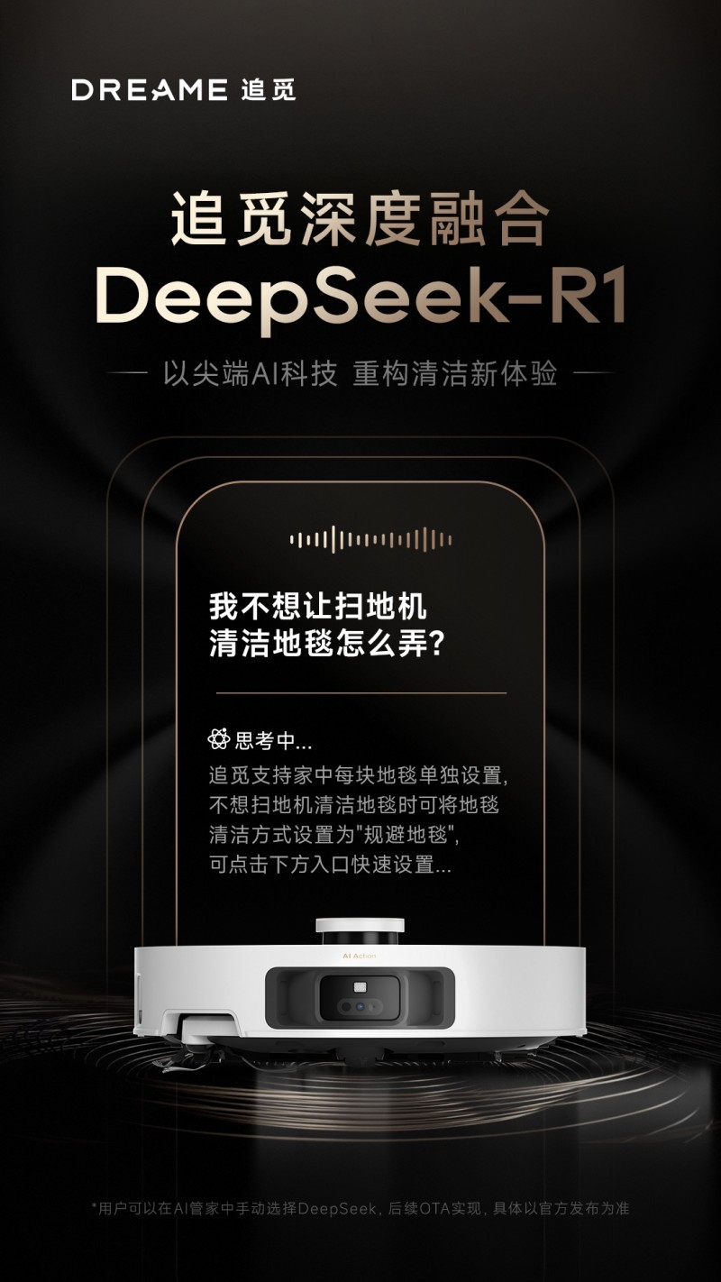 2月21日,追觅科技旗下Dreamehome APP已接入DeepSeek-R1大模型,即将于2月24日发布的追觅S50系列扫地机器人也将成为市面上首批搭载DeepSeek-R1的智能清洁类产品。