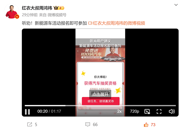 据悉,周鸿祎推出的免费送100辆国产新能源车活动,此前参与抽奖时有一定门槛。