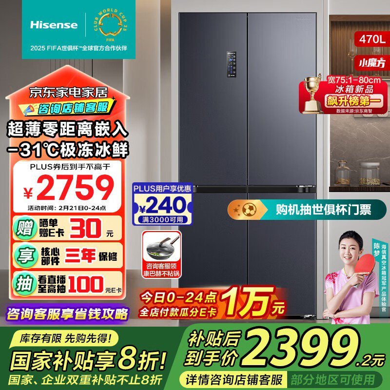 海信470小魔方冰箱,一级能效静音舒适,限时空置价1637元