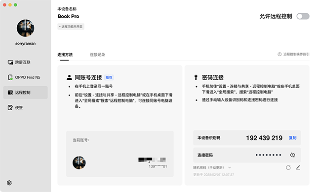 而OPPO Find N5远控电脑,你的手机就是你的笔记本,这时我们可以通过账号密码的形式与公司或家中的MacBook连接进行镜像。