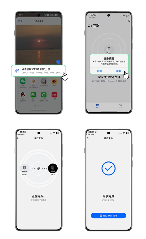 要是想要将OPPO Find N5上的图片、实况照片和文件传到iPhone上,操作步骤也没有很大的差别,只要在iPhone上面下载一个「O+互联」,然后再OPPO Find N5上找到iPhone并选择发送就可以了,可以说OPPO的这个操作,可以说是直接在iOS的封闭系统上撕开了一大道口子。