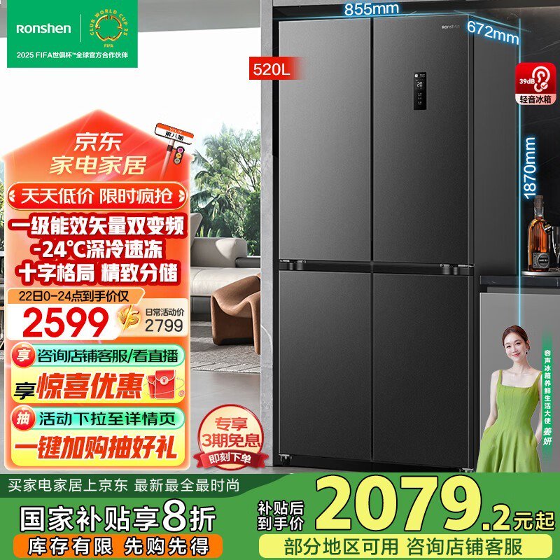 容声520升十字四开门冰箱BCD-520WD12FP京东特惠