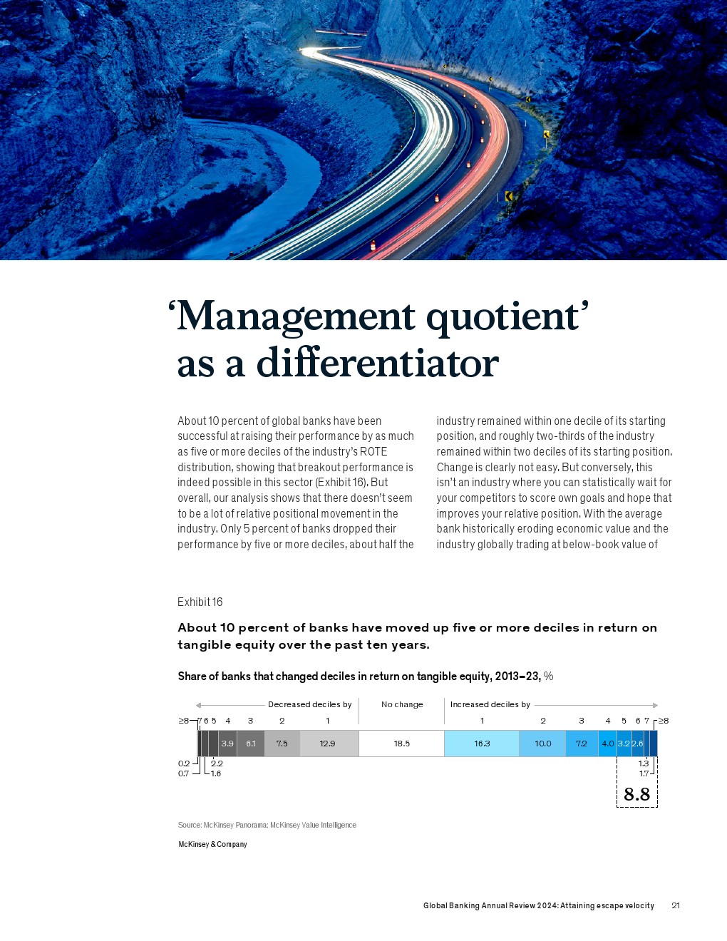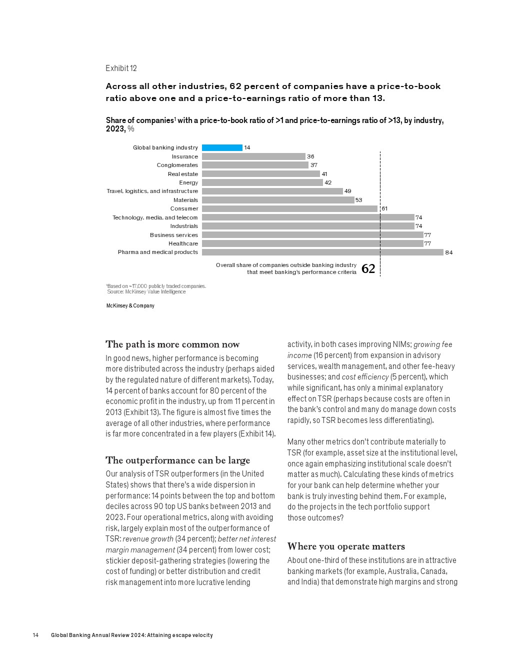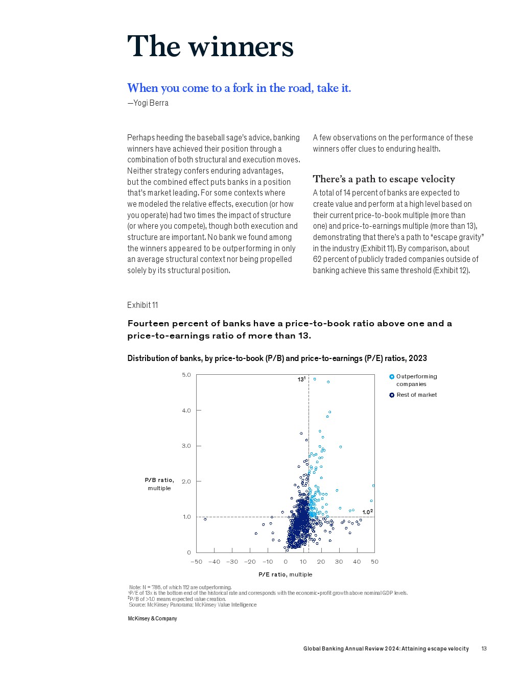 对其他行业来说,好消息是情况可以得到改善。事实上,在过去的五年里,大约10%的行业的有形股本回报率提高了5个百分点。银行业要想恢复其市盈率,管理团队需要召唤出这些赢家的活力。