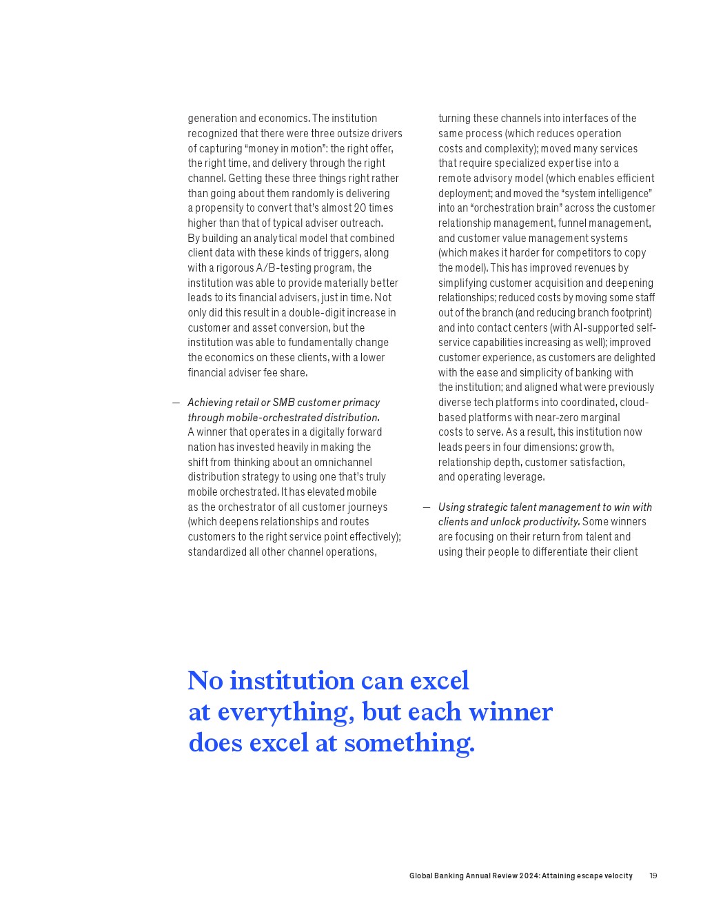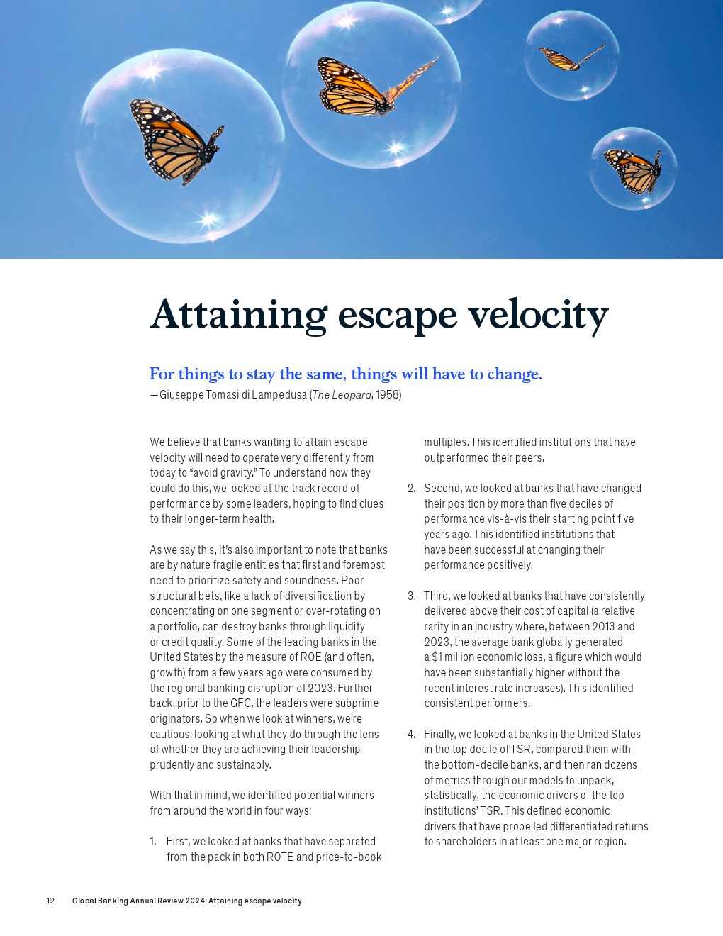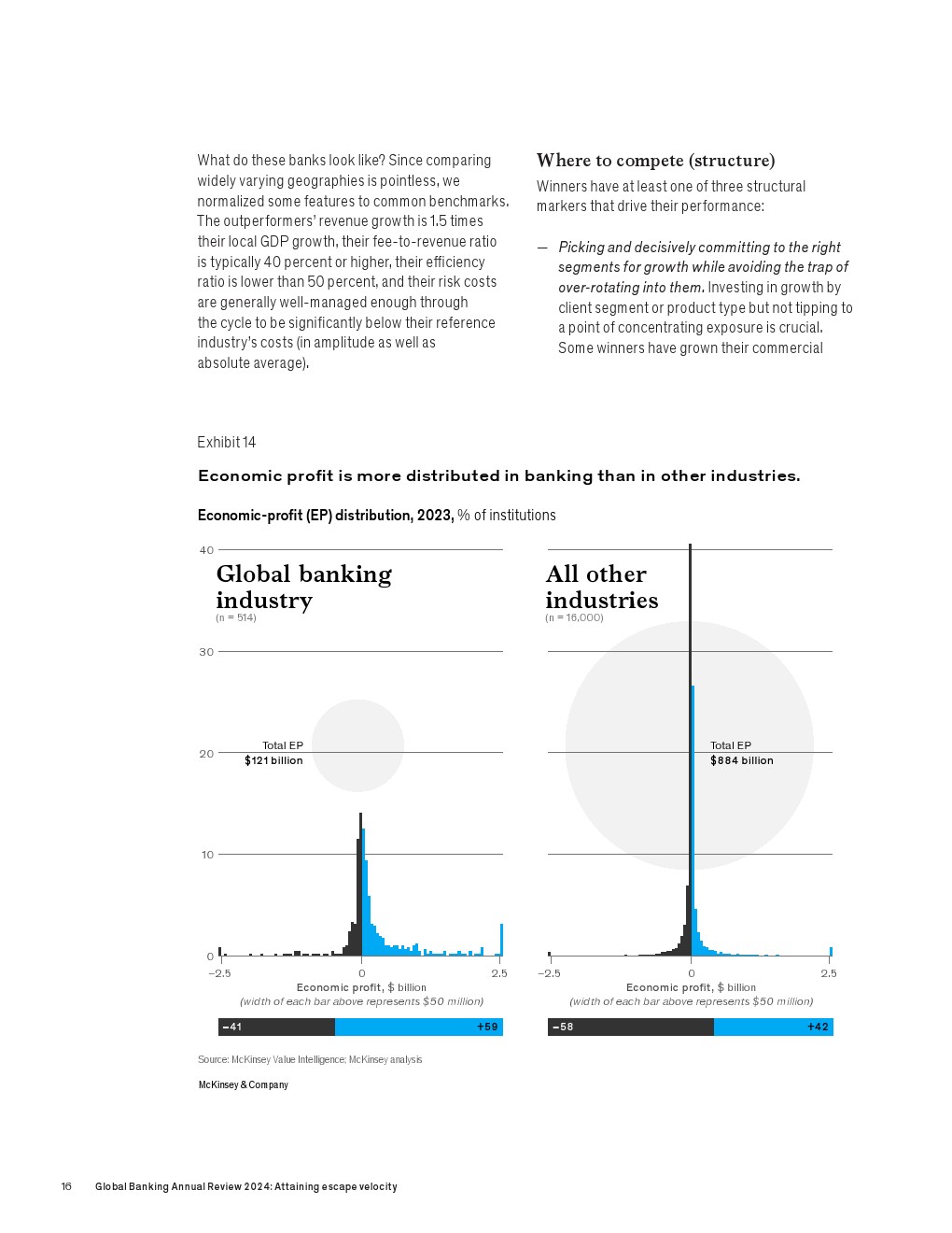 看看过去5到10年表现优异的银行,或许能找到银行如何实现逃逸速度的答案。报告通过多种分析视角确定了这些赢家。他们通过在三个结构维度和在一系列能力上严格的运营执行相结合,取得了胜利。
