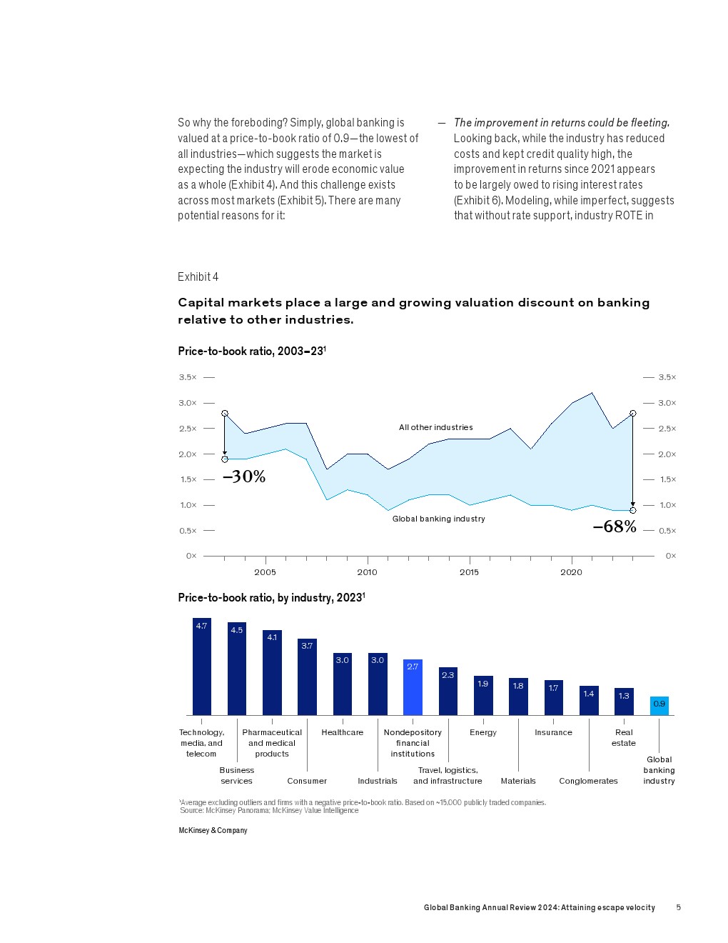过去两年是银行业自2007年-2009年全球金融危机(GFC)爆发以来最好的两年,盈利能力、资本和流动性都很健康。尽管银行业是全球最大的单一盈利行业,但市场对长期价值创造持怀疑态度,在市净率方面,银行业在所有行业中排名垫底。