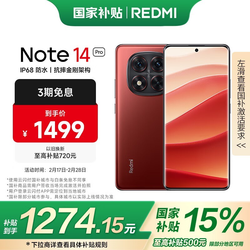 红米Note 14 Pro 5G 8GB+256GB 运动优惠价1274元