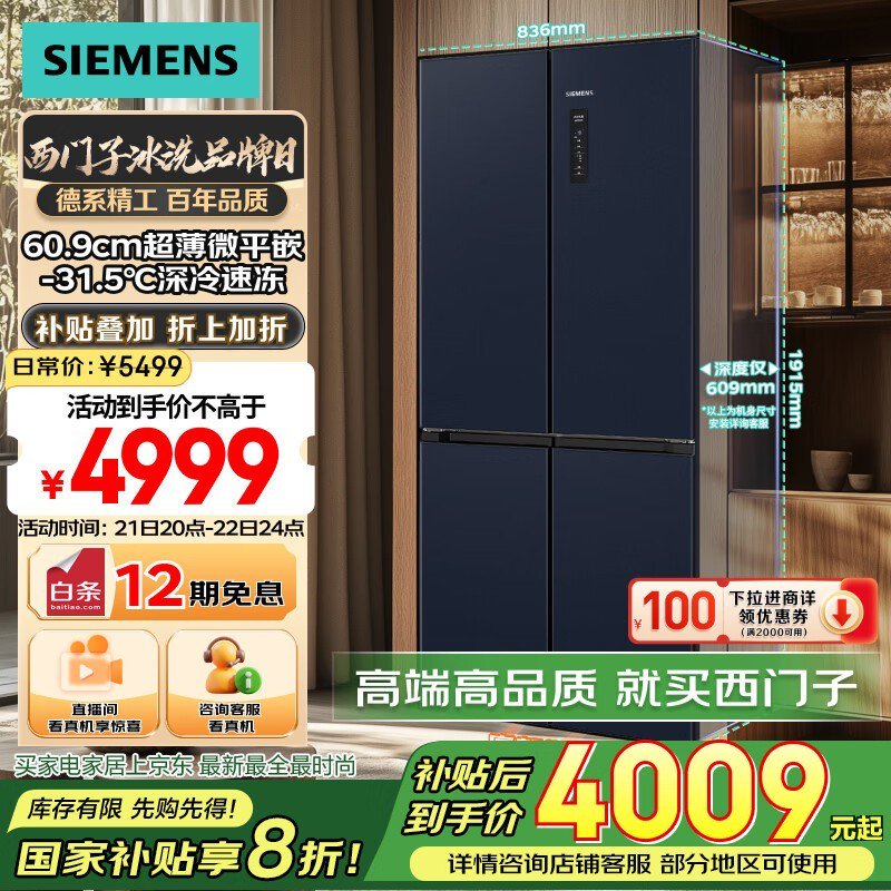 西门子497升超薄平嵌冰箱十字门促销到手3982元