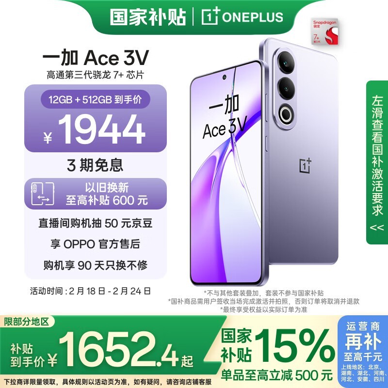 一加Ace3V手机幻紫银12GB+512GB大存储天马屏骁龙7+处理器